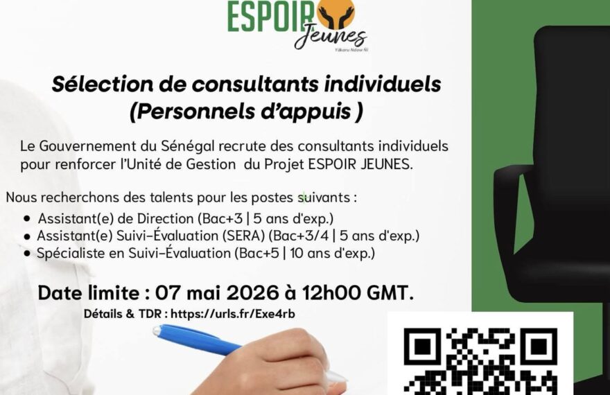 Le Gouvernement du Sénégal recrute des consultants individuels pour renforcer l’Unité de Gestion du Projet ESPOIR JEUNES. ✅ Assistant(e) de Direction (Bac+3 | 5 ans d’exp.) ✅ Assistant(e) Suivi-Évaluation (SERA) (Bac+3/4 | 5 ans d’exp.) ✅ Spécialiste en Suivi-Évaluation (Bac+5 | 10 ans d’exp.) 🔗 Détails & TDR : urls.fr/Exe4rb 📧 Candidature : Envoyez