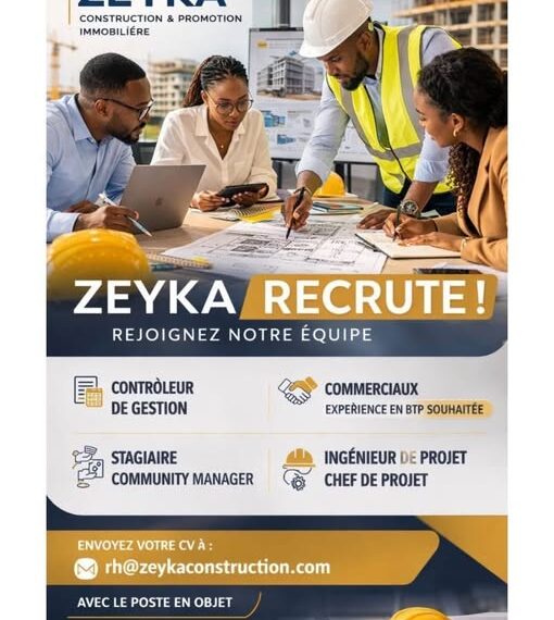 ZEYKA recrute ! Dans le cadre de son expansion, ZEYKA Construction & Promotion Immobilière renforce ses équipes. Postes ouverts : • Contrôleur de gestion • Commerciaux (expérience BTP souhaitée) • Ingénieur de projet • Chef de projet • Stagiaire Community Manager Envoyez votre CV à : rh@zeykaconstruction.com (poste en objet)