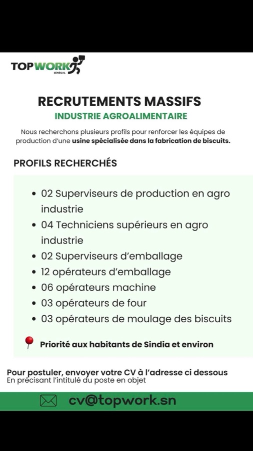AVIS : Industrie agroalimentaire Usine de Biscuits à Sindia (Thiès) recrute 32 Agents (H/F)