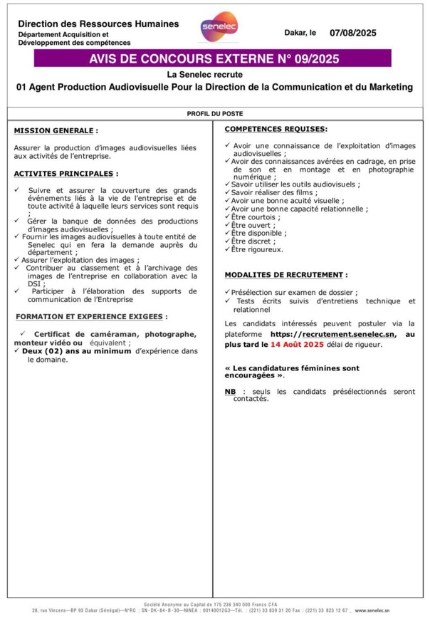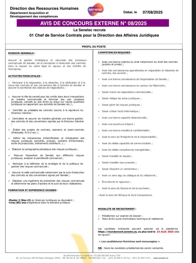 AVIS : La Senelec recrute !