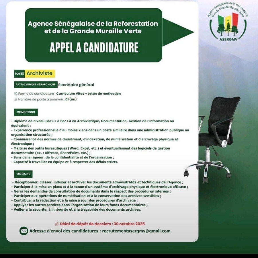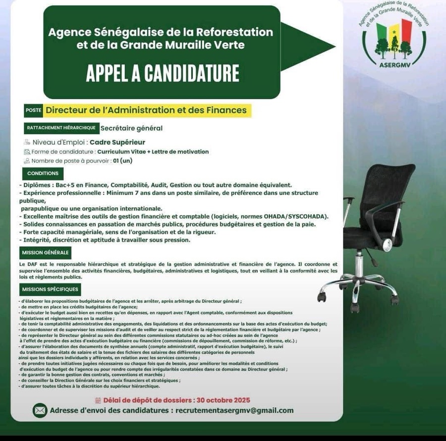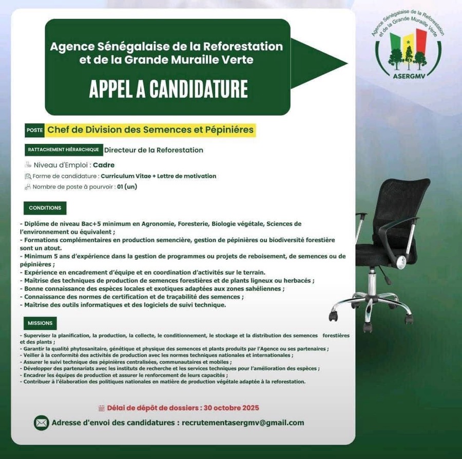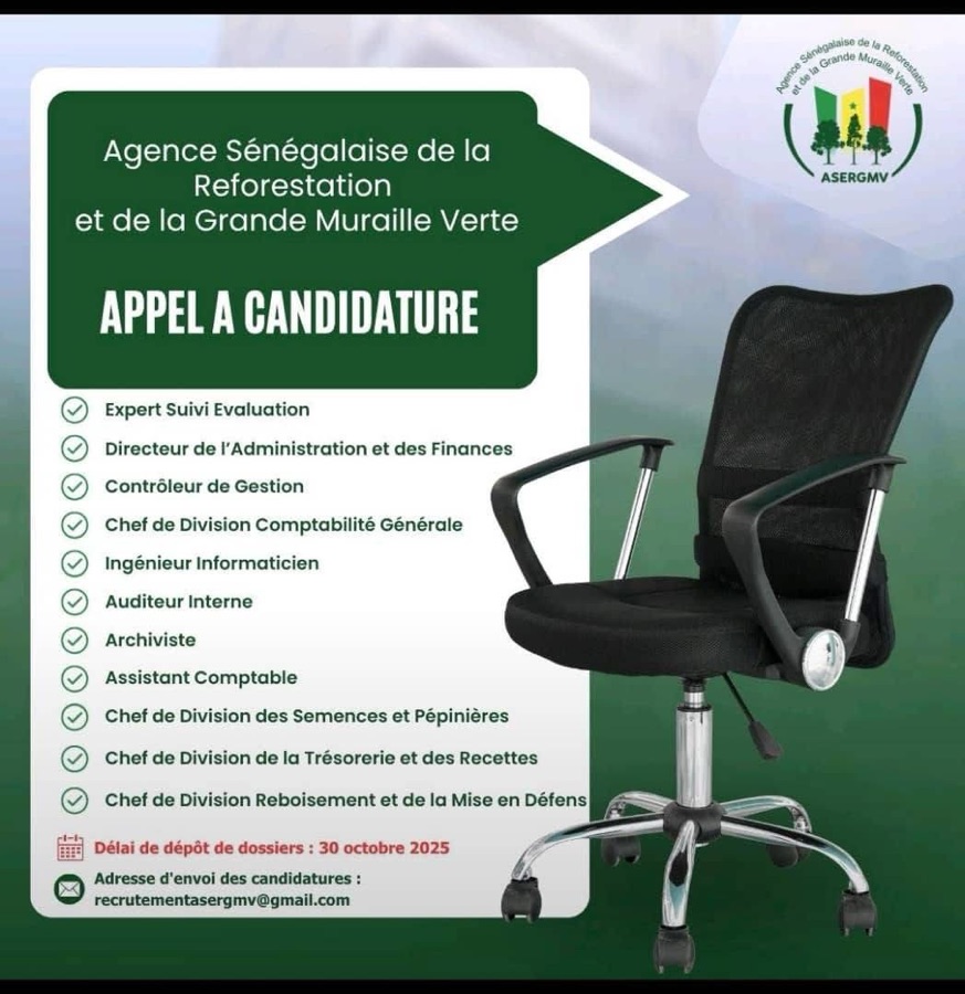 AVIS : L’Agence Sénégalaise de la Reforestation et de la Grande Muraille Verte (ASERGMV) recrute !