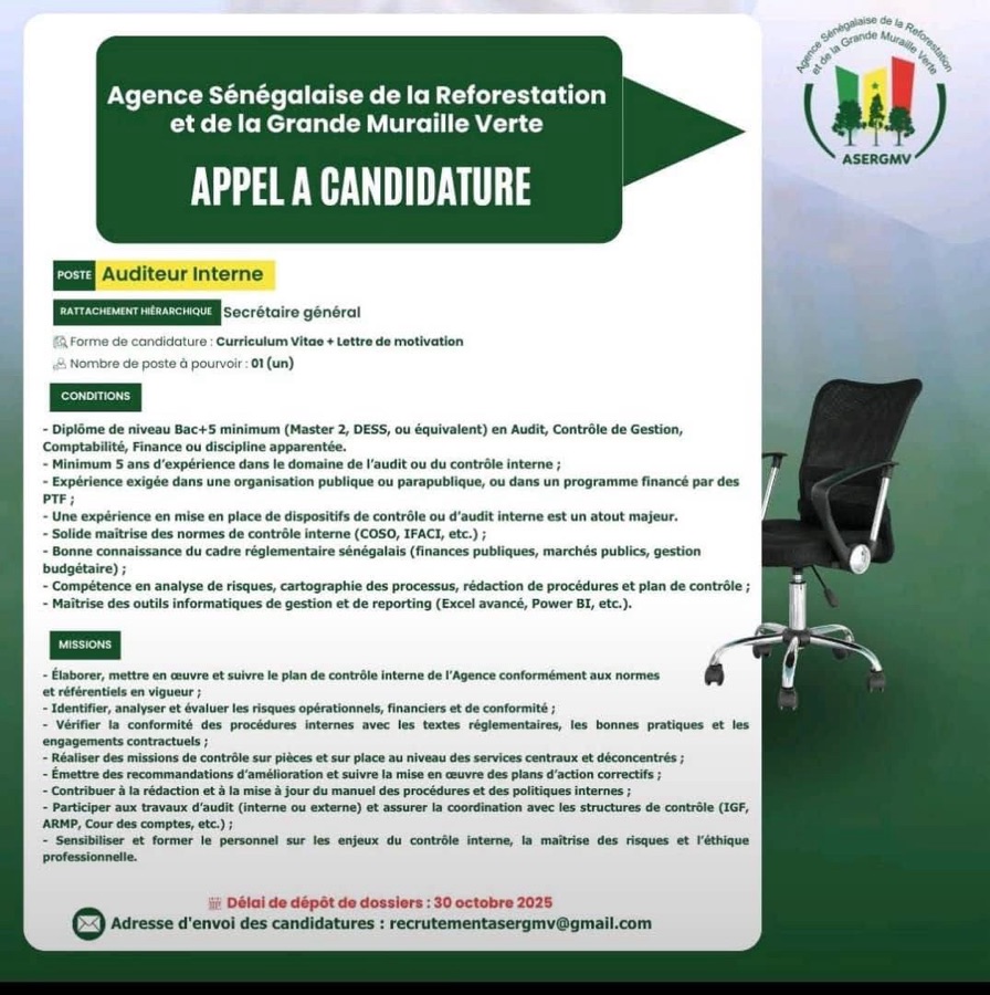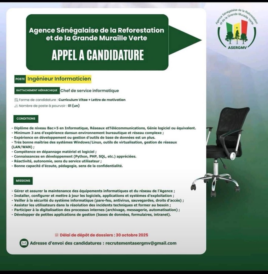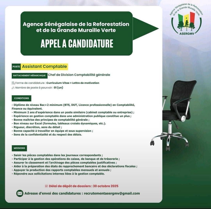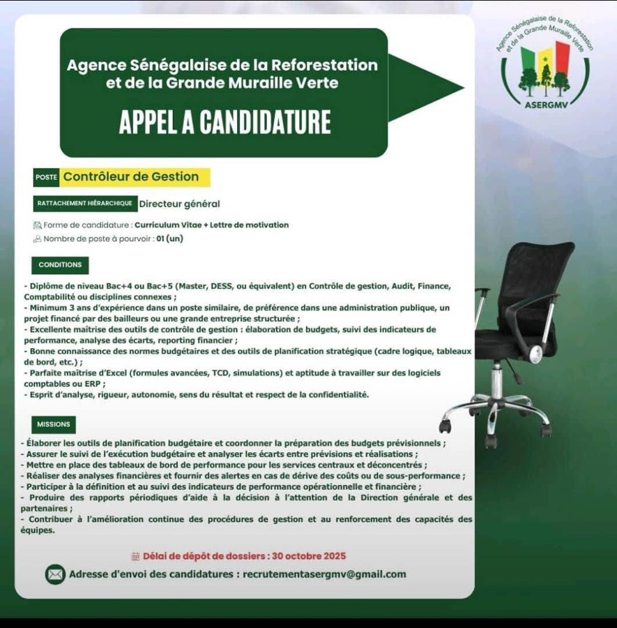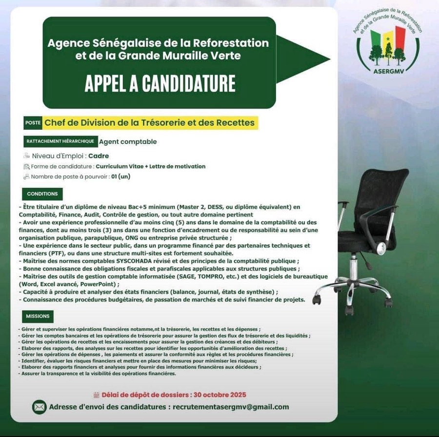 AVIS : L’Agence Sénégalaise de la Reforestation et de la Grande Muraille Verte (ASERGMV) recrute !