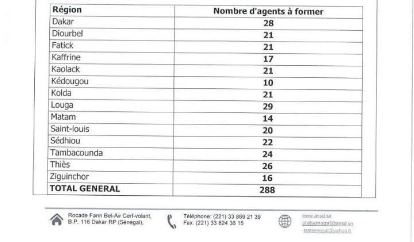 L’Agence nationale de la Statistique et de la Démographie (ANSD) lance un appel à candidatures pour le recrutement de deux cent quatre-vingt-huit (288) agents de collecte pour le recensement national des organisations communautaires de base (RN/OCB), dans le cadre du projet d’Harmonisation et d’Amélioration des Statistiques en Afrique de l’Ouest et du Centre (PHASAOC/SN), pour une durée de deux (2) mois.