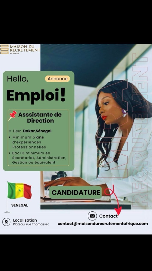La Maison du Recrutement, votre cabinet de recrutement, disposant d’un réseau solide et d’un vivier de talents qualifiés en Afrique de l’Ouest, recherche pour ses partenaires une 𝗔𝘀𝘀𝗶𝘀𝘁𝗮𝗻𝘁𝗲 𝗱𝗲 𝗗𝗶𝗿𝗲𝗰𝘁𝗶𝗼𝗻 avec minimum 𝟱 𝗮𝗻𝘀 d’expériences.