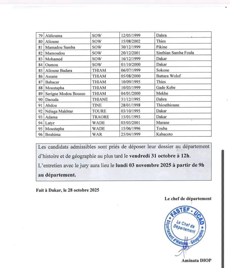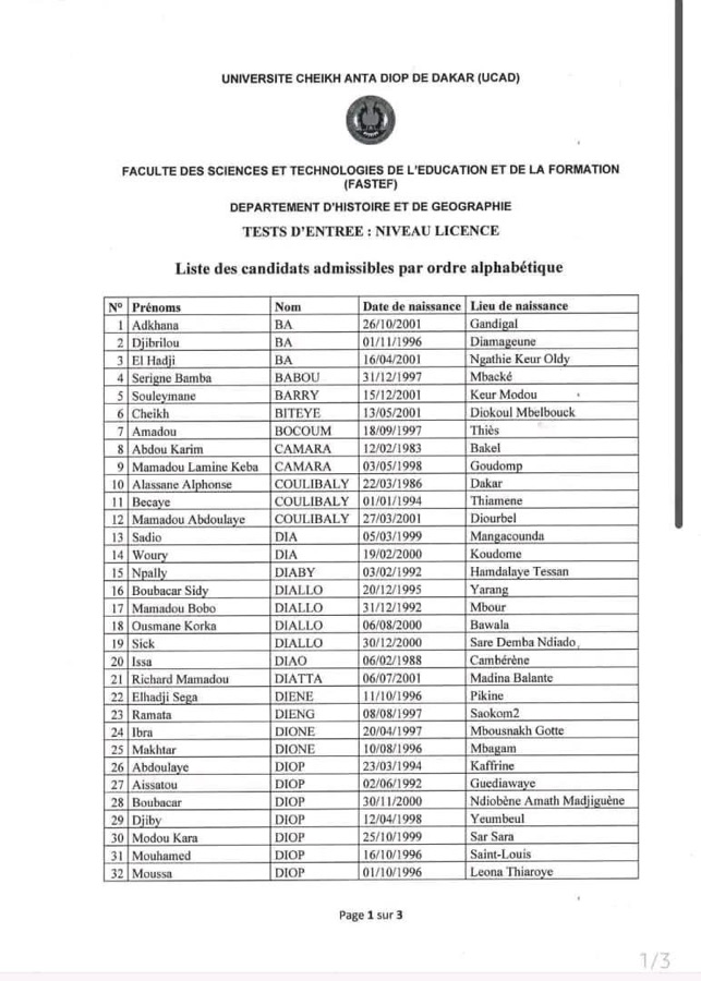 AVIS : Résultats concours FASTEF 2025 – Niveau : Licence – Option : Histoire-Géographie
