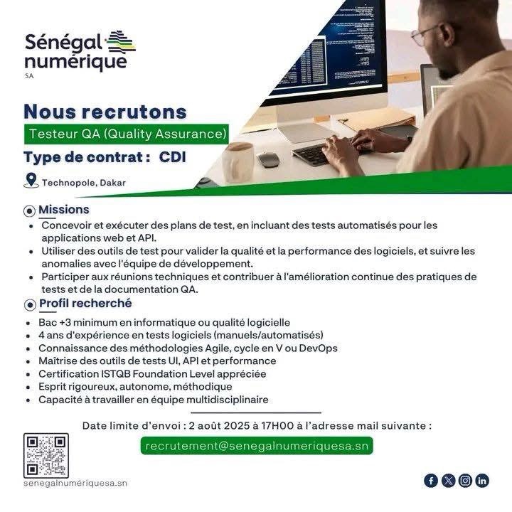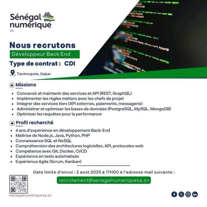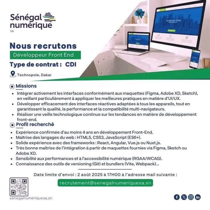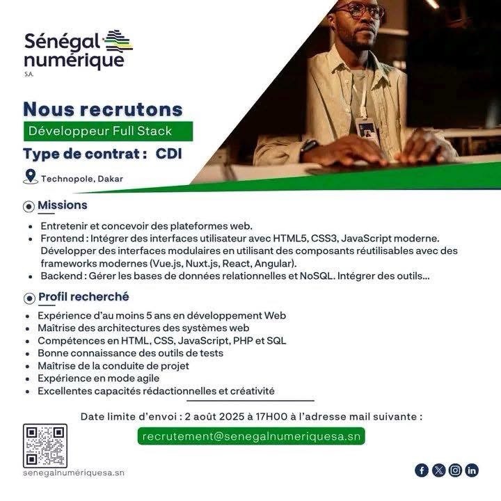 Actualité Concours & Emploi AVIS : Sénégal numérique recrute Quatre Agents (H/F) – Contrat : CDI Sénégal numérique recrute ces profils…Suite… Suite…Suite…Fin Tags: Partagez la bonne info avec vos amis Navigation de l’articlePrécédant Précédant:Bacheliers 2025 : déposez votre dossier pour intégrer l’École Inter-États de Médecine Vétérinaire !Suivant Suivant:Arrestation d’un faux ambassadeur de nations fictives ayant escroqué des demandeurs d’emploi Djiby SENE Journaliste et Blogueur, Fondateur du Blog de la Jeunesse Consciente. Follow Me: Articles similaires Badiouré : une élève de seconde décède à l’hôpital de Bignona après une morsure de serpent Ousmane Sonko appelle à l’apaisement et réaffirme la solidité du partenariat historique entre le Sénégal et le Maroc Portrait – Pape Bouna Thiaw, l’homme qui a pris le temps de l’histoire CAN 2025 : quatre Lions sénégalais, dont Sadio Mané, dans l’équipe type de la CAF Dossier AEE POWER : la Cour suprême annule la décision de l’ARCOP et donne raison à l’ASER Sacre des Lions : 75 millions FCFA et 1 500 m² offerts à chaque Lion par le président et des primes pour toute la délégation