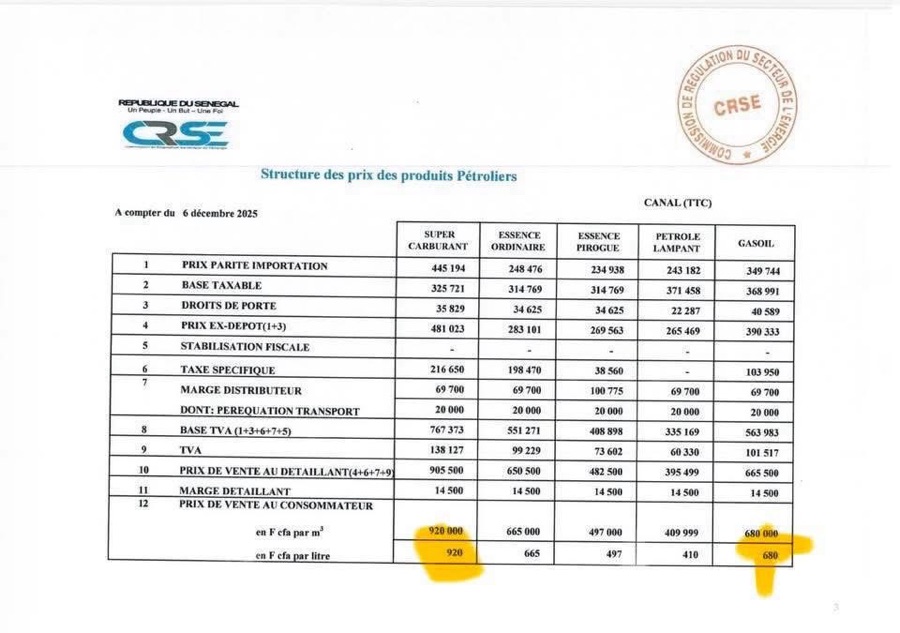 La baisse tant attendue des prix des produits pétroliers est désormais une réalité, et elle s’appuie sur des chiffres précis rendus publics dans la dernière structure tarifaire émise par la Commission de Régulation du Secteur de l’Énergie (CRSE). À compter du 6 décembre 2025, le marché sénégalais bascule vers une nouvelle grille qui allège concrètement la charge des consommateurs. Selon le document officiel, le supercarburant est désormais fixé à 920 F CFA le litre, tandis que le gasoil descend à 680 F CFA. Deux montants clairement mis en évidence dans le tableau, fruits d’un calcul transparent intégrant le prix parité importation, la base taxable, les droits de porte, les taxes spécifiques, la TVA et la marge distributeur.