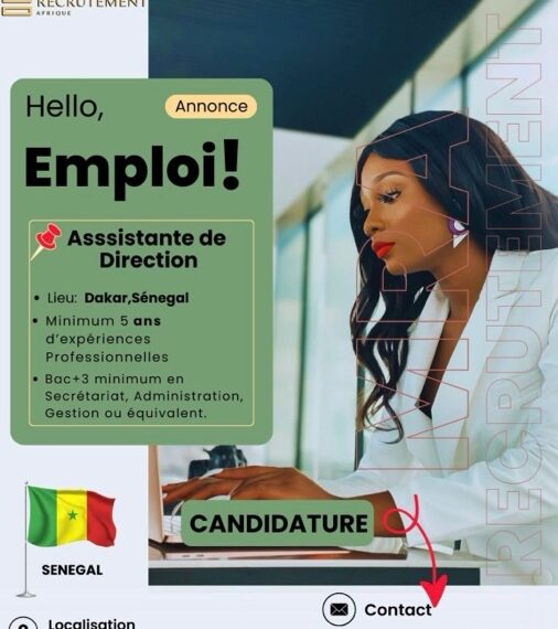 🚨𝗥𝗲𝗰𝗿𝘂𝘁𝗲𝗺𝗲𝗻𝘁 – 𝗔𝘀𝘀𝗶𝘀𝘁𝗮𝗻𝘁𝗲 𝗱𝗲 𝗗𝗶𝗿𝗲𝗰𝘁𝗶𝗼𝗻 🚨La Maison du Recrutement, votre cabinet de recrutement, disposant d’un réseau solide et d’un vivier de talents qualifiés en Afrique de l’Ouest, recherche pour ses partenaires une 𝗔𝘀𝘀𝗶𝘀𝘁𝗮𝗻𝘁𝗲 𝗱𝗲 𝗗𝗶𝗿𝗲𝗰𝘁𝗶𝗼𝗻 avec minimum 𝟱 𝗮𝗻𝘀 d’expériences.📍 Poste basé à Dakar⛑️ Missions :Gestion de l’agenda et organisation des réunions.Suivi