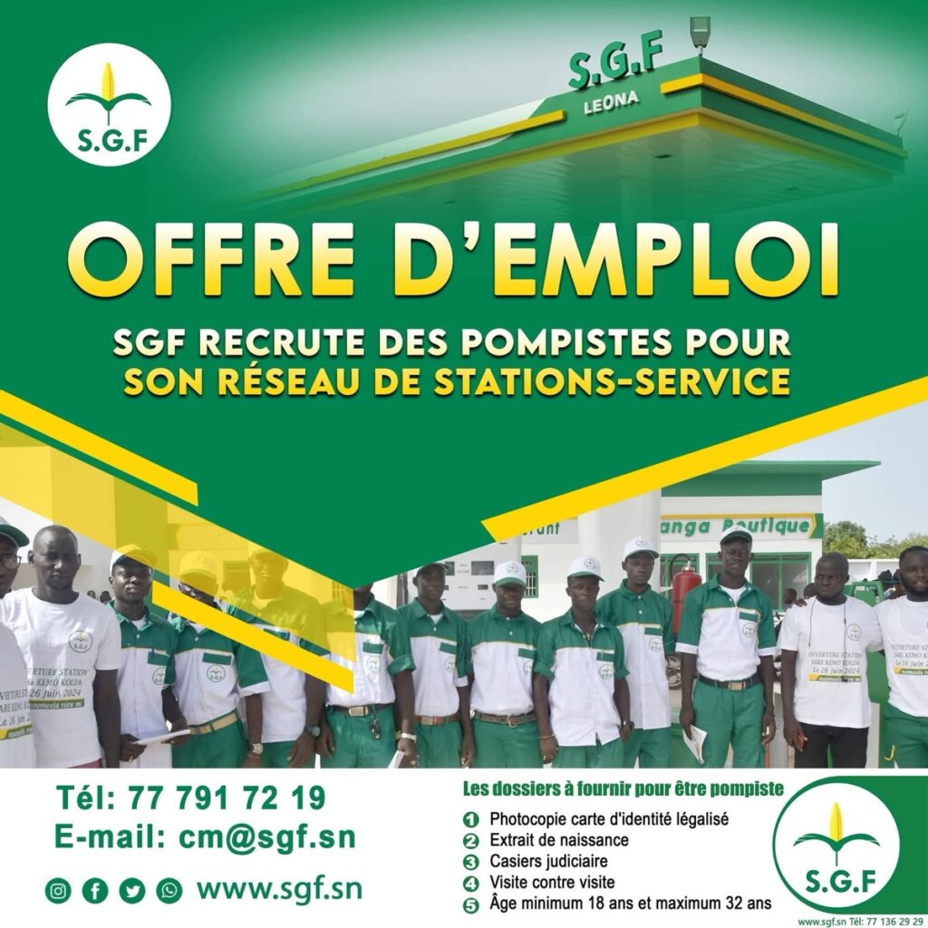 La Société SGF a lancé une campagne de recrutement de pompistes en vue de renforcer son réseau de stations-service à travers le Sénégal, selon une annonce consultée par SenBaat.