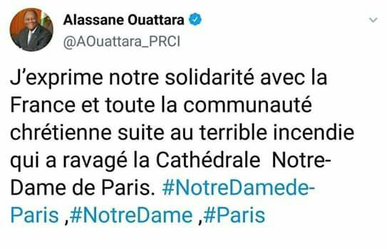 Le terrible incendie qui a ravagé hier une bonne partie de l’un des plus grands symboles de la France, Notre Dame, datant du 12ème siècle n’a pas laissé pantois certains présidents africains. Le président sénégalais, Macky Sall, le président de la Côte-d’Ivoire leur homologue Burkinabé Roch Kaboré ont tous exprimé, à travers leur compte Twitter, leur soutien à la France et à la communauté chrétienne.