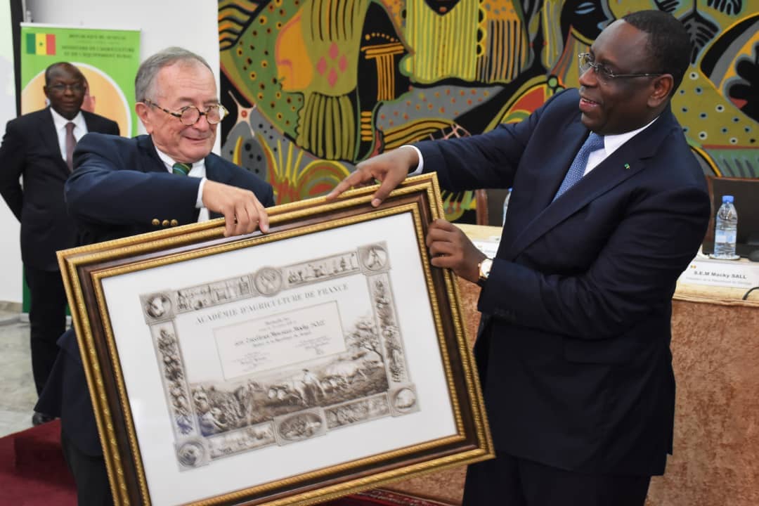 » Le président de la République Macky Sall est le premier Chef d’Etat africain à recevoir la plus haute distinction de l’académie des sciences et techniques d’agriculture de la France », a dit le Secrétaire perpétuel de l’Académie Gérard Tendron, lors de la Cérémonie de remise de la médaille d’Or au président Sall.