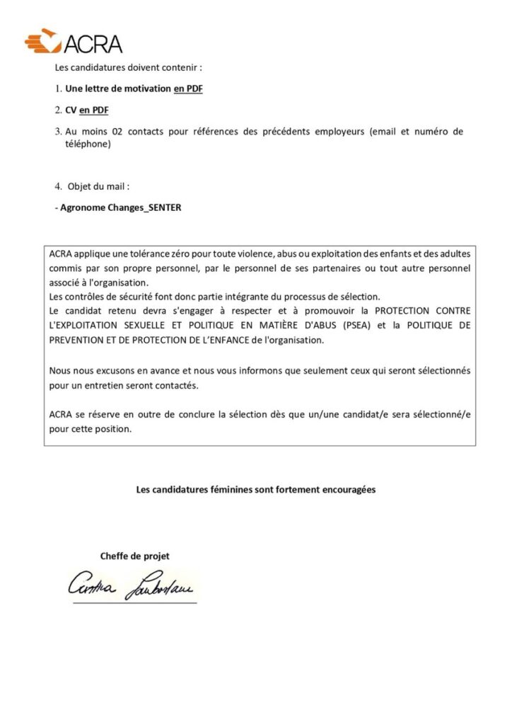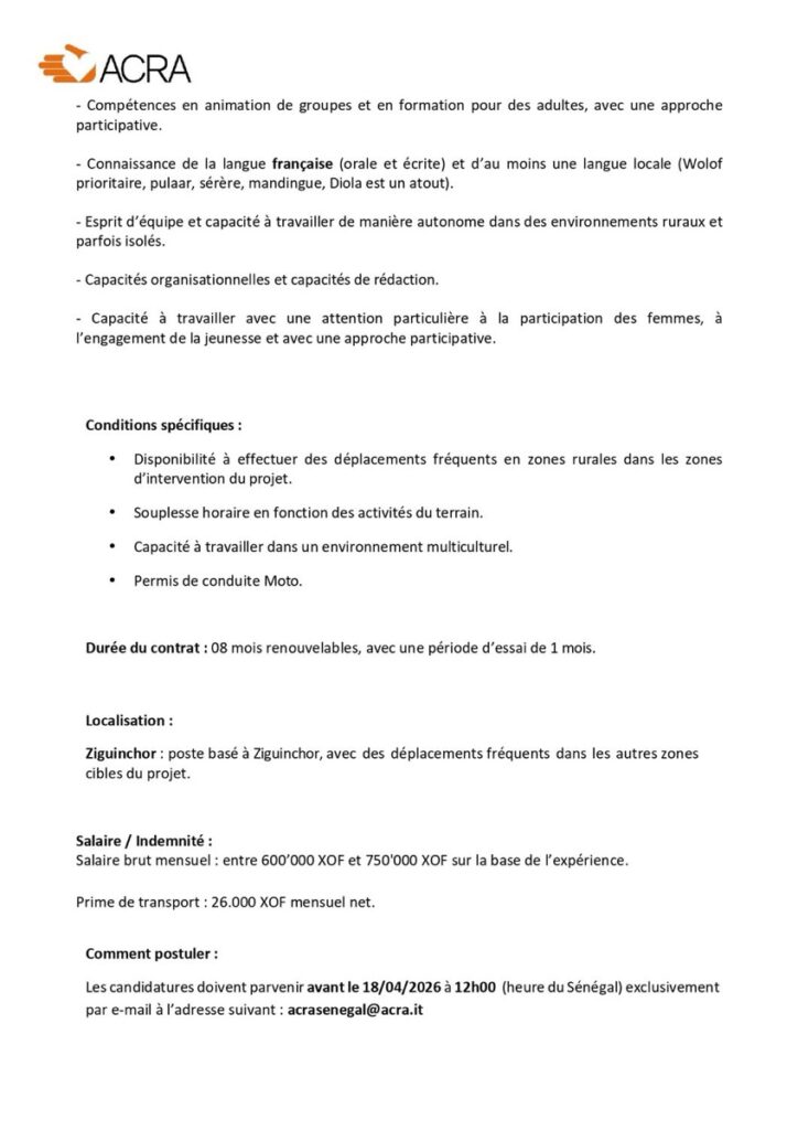 Les candidatures doivent parvenir exclusivement par e-mail (version PDF) à : acrasenegal@acra.it avec le suivant objet de l’email :