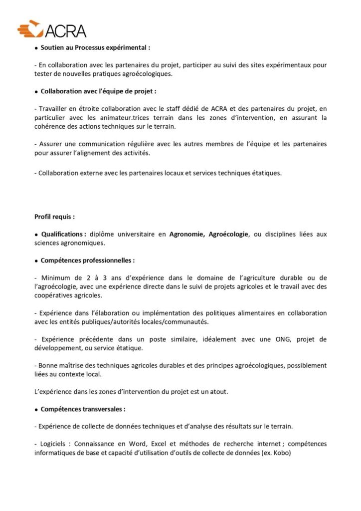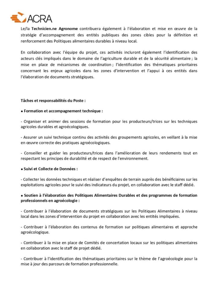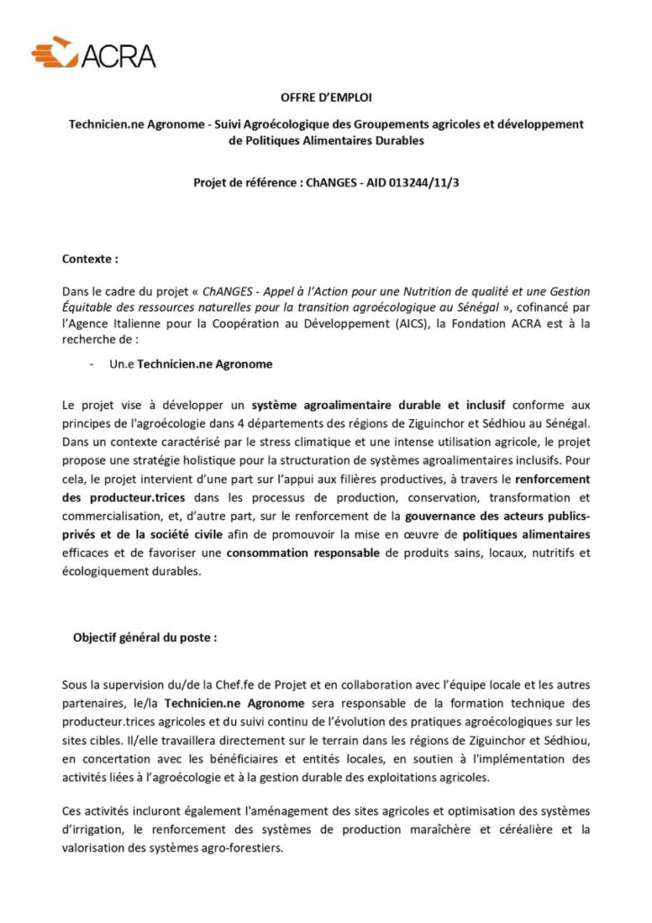 ACRA au Sénégal est à la recherche d’un.e Technicien.ne Agronome dans le cadre du projet « ChANGES – Appel à l’Action pour une Nutrition de qualité et une Gestion Équitable des ressources naturelles pour la transition agroécologique au Sénégal ».