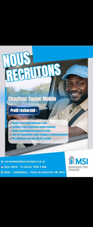 Poste recherché : Chauffeur – Équipe Mobile (Thiès).