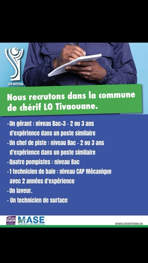 Pour l’ouverture d’une station dans la commune de chérif LO Tivaouane, nous recrutons plusieurs profils.