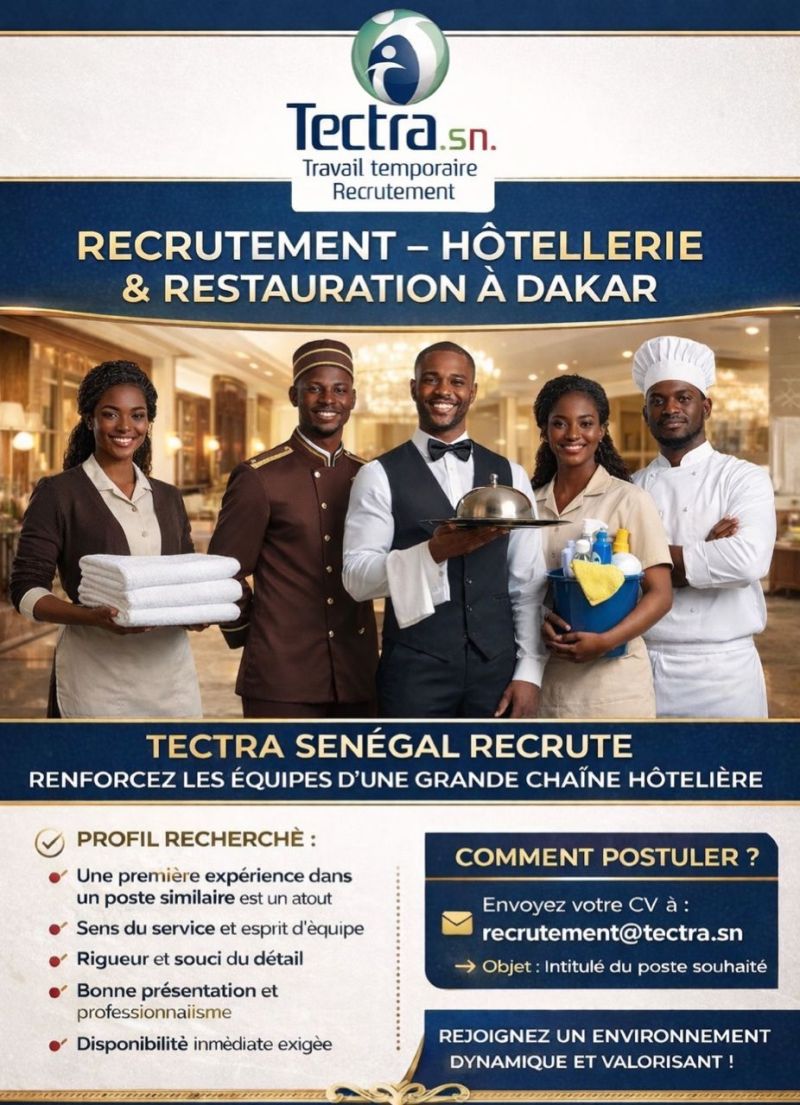 Dans le cadre d’un partenariat avec une très grande chaîne hôtelière de la place, Tectra Sénégal recrute plusieurs profils motivés et disponibles immédiatement pour renforcer ses équipes :