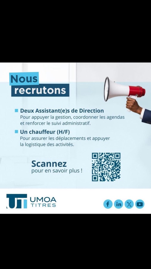 UMOA-Titres lance deux recrutements pour renforcer ses équipes à Dakar (Sénégal) :